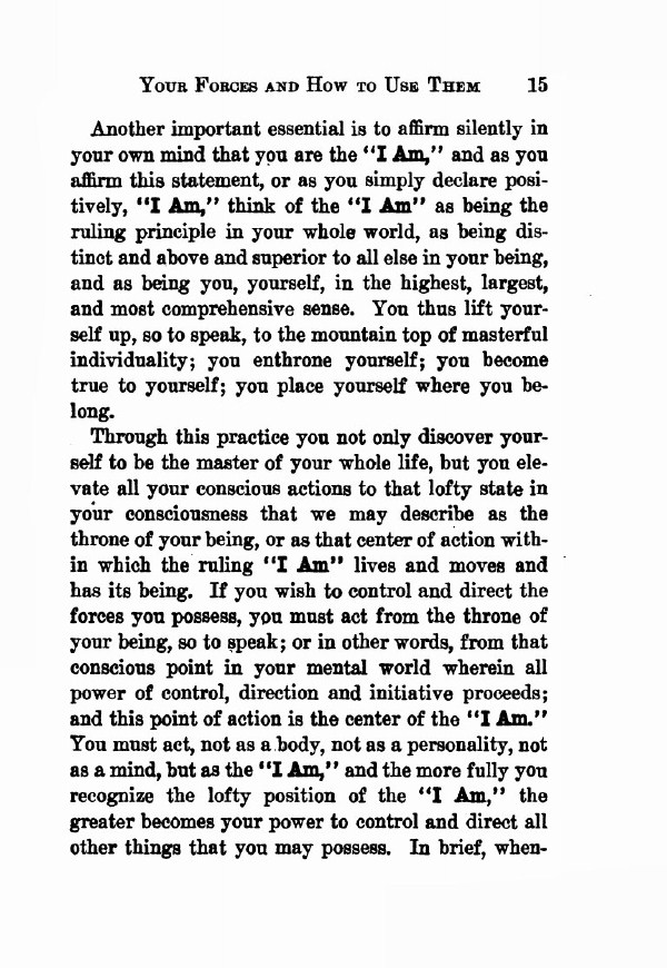 If you wish to control and direct the forces you possess, you must act from the throne of your being, so to speak or in other words, from that conscious point in your mental world wherein all power of control, direction and initiative proceeds; and this point of action is the centre of the "I Am." You must act, not as a body, not as a personality, not as a, mind, but as the "I Am," and the more fully you recognize the lofty position of the "I Am," the greater becomes your power to control and direct all other things that you may possess.In brief, whenever
