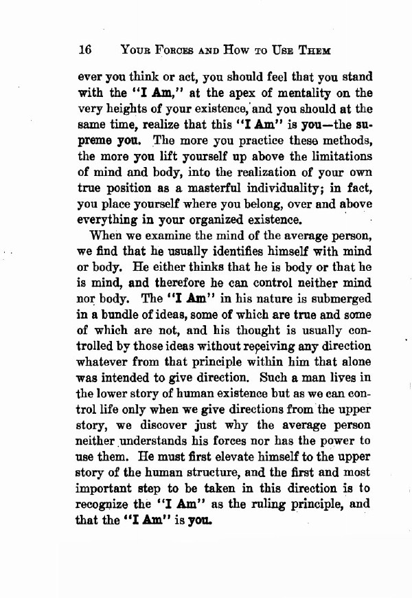 you think or act, you should feel that you stand with the "I Am," at the apex of mentality on the very heights of your existence, and you should at the same time, realize that this "I Am" is you -- the supreme you. The more you practice these methods, the more you lift yourself up above the limitations of mind and body, into the realization of your own true position as a masterful individuality; in fact, you place yourself where you belong, over and above everything in your organised existence.