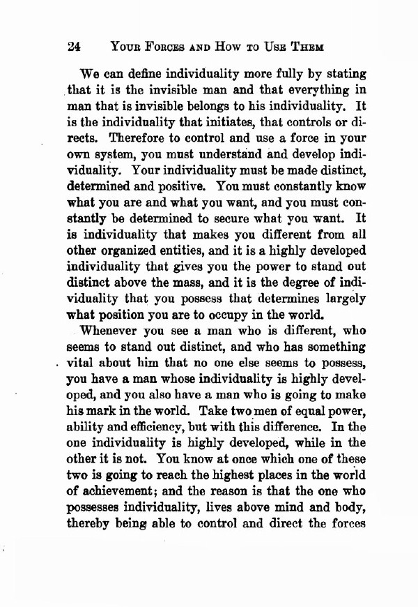 We can define individuality more fully by stating that it is the invisible man and that everything in man that is invisible belongs to his individuality. It is the individuality that initiates, that controls or directs. Therefore to control and use a force in your own system, you must understand and develop individuality. Your individuality must be made distinct, determined and positive. You must constantly know what you are and what you want, and you must constantly be determined to secure what you want. It is individuality that makes you different from all other organised entities, and it is a highly developed individuality that gives you the power to stand out distinct above the mass, and it is the degree of individuality that you possess that determines largely what position you are to occupy in the world.