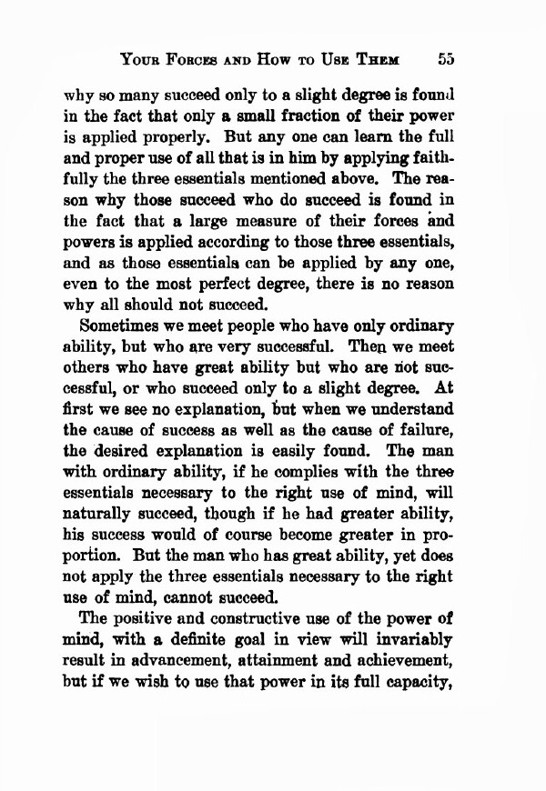 Sometimes we meet people who have only ordinary ability, but who are very successful. Then we meet others who have great ability but who are not successful, or who succeed only to a slight degree. At first we see no explanation, but when we understand the cause of success as well as the cause of failure, the desired explanation is easily found. The man or woman with ordinary ability, if they comply with the three essentials necessary to the right use of mind, will naturally succeed, though if they had greater ability, their success would of course become greater in proportion. But the individual who has great ability, yet does not apply the three essentials necessary to the right use of mind, cannot succeed.