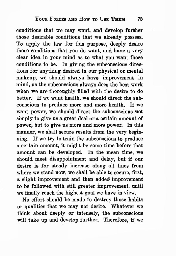 conditions that we may want, and develop further those desirable conditions that we already possess. To apply the law for this purpose, deeply desire those conditions that you do want, and have a very clear idea in your mind as to what you want those conditions to be. In giving the subconscious directions for anything desired in our physical or mental makeup, we should always have improvement in mind, as the subconscious always does the best work when we are thoroughly filled with the desire to do better. If we want health, we should direct the subconscious to produce more and more health. If we want power, we should direct the subconscious not simply to give us a great deal or a certain amount of power, but to give us more and more power. In this manner, we shall secure results from the very beginning. If we try to train the subconscious to produce a certain amount, it might be some time before that amount can be developed. In the meantime, we should meet disappointment and delay, but if our desire is for steady increase along all lines from where we stand now, we shall be able to secure, first, a slight improvement and then added improvement to be followed with still greater improvement until we finally reach the highest goal we have in view.