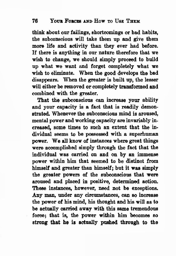 think about our failings, shortcomings or bad habits, the subconscious will take them up and give them more life and activity than they ever had before. If there is anything in our nature therefore that we wish to change, we should simply proceed to build up what we want and forget completely what we wish to eliminate. When the good develops, the bad disappears. When the greater is built up, the lesser will either be removed or completely transformed and combined with the greater.