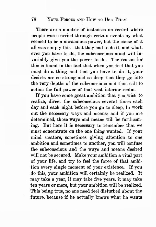 If you have some great ambition that you wish to realize, direct the subconscious several times each day and each night before you go to sleep, to work out the necessary ways and means; and if you are determined, those ways and means will be forthcoming. But here it is necessary to remember that we must concentrate on the one thing wanted. If your mind scatters, sometimes giving attention to one ambition and sometimes to another, you will confuse the subconscious and the ways and means desired will not be secured. Make your ambition a vital part of your life, and try to feel the force of that ambition every single moment of your existence. If you do this, your ambition will certainly be realized. It may take a year, it may take five years, it may take ten years or more, but your ambition will be realized. This being true, no one need feel disturbed about the future, because if he actually knows what he wants