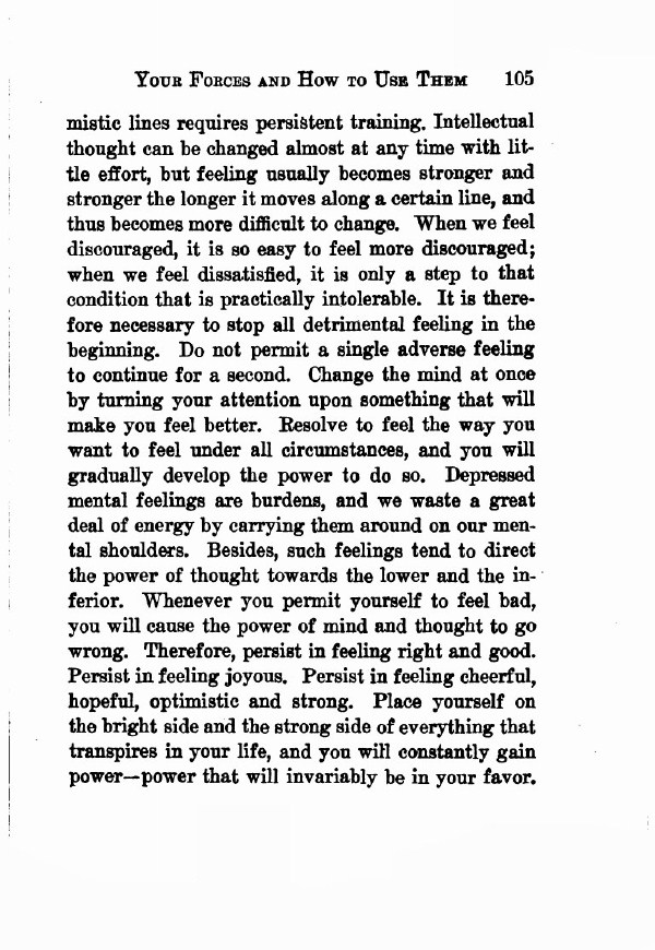 When we feel discouraged, it is so easy to feel more discouraged; when we feel dissatisfied, it is only a step to that condition that is practically intolerable. It is therefore necessary to stop all detrimental feeling in the beginning. Do not permit a single adverse feeling to continue for a second. Change the mind at once by turning your attention upon something that will make you feel better. Resolve to feel the way you want to feel under all circumstances, and you will gradually develop the power to do so. Depressed mental feelings are burdens, and we waste a great deal of energy by carrying them around on our mental shoulders. Besides, such feelings tend to direct the power of thought towards the lower and the inferior.