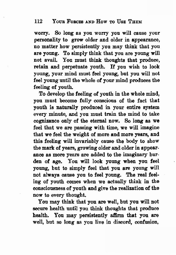 worry. So long as you worry you will cause your personality to grow older and older in appearance, no matter how persistently you may think that you are young. To simply think that you are young will not avail. You must think thoughts that produce, retain and perpetuate youth. If you wish to look young, your mind must feel young, but you will not feel young until the whole of your mind produces the feeling of youth.