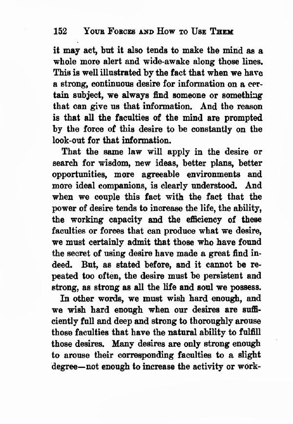 In other words, we must wish hard enough, and we wish hard enough when our desires are sufficiently full and deep and strong to thoroughly arouse those faculties that have the natural ability to fulfil those desires. Many desires are only strong enough to arouse their corresponding faculties to a slight degree -- not enough to increase the activity or working