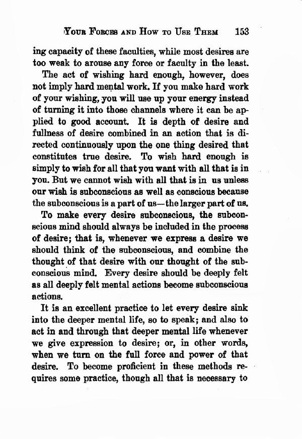 The act of wishing hard enough, however, does not imply hard mental work. If you make hard work of your wishing, you will use up your energy instead of turning it into those channels where it can be applied to good account. It is depth of desire and fullness of desire combined in an action that is directed continuously upon the one thing desired that constitutes true desire. To wish hard enough is simply to wish for all that you want with all that is in you. But we cannot wish with all that is in us unless our wish is subconscious as well as conscious because the subconscious is a part of us -- the larger part of us.