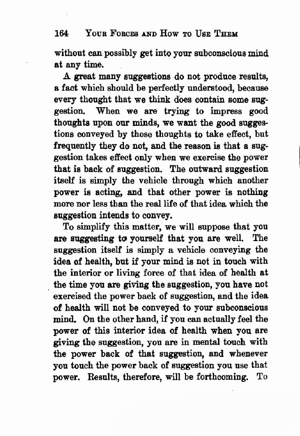 To simplify this matter, we will suppose that you are suggesting to yourself that you are well. The suggestion itself is simply a vehicle conveying the idea of health, but if your mind is not in touch with the interior or living force of that idea of health at the time you are giving the suggestion, you have not exercised the power back of suggestion, and the idea of health will not be conveyed to your subconscious mind. On the other hand, if you can actually feel the power of this interior idea of health when you are giving the suggestion, you are in mental touch with the power back of that suggestion, and whenever you touch the power back of suggestion you use that power. Results, therefore, will be forthcoming. To