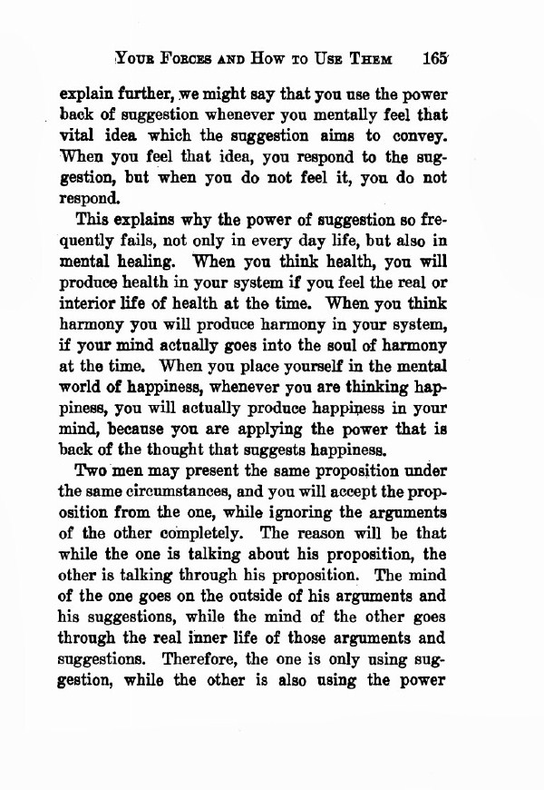 explain further, we might say that you use the power back of suggestion whenever you mentally feel that vital idea which the suggestion aims to convey. When you feel that idea, you respond to the suggestion, but when you do not feel it, you do not respond.