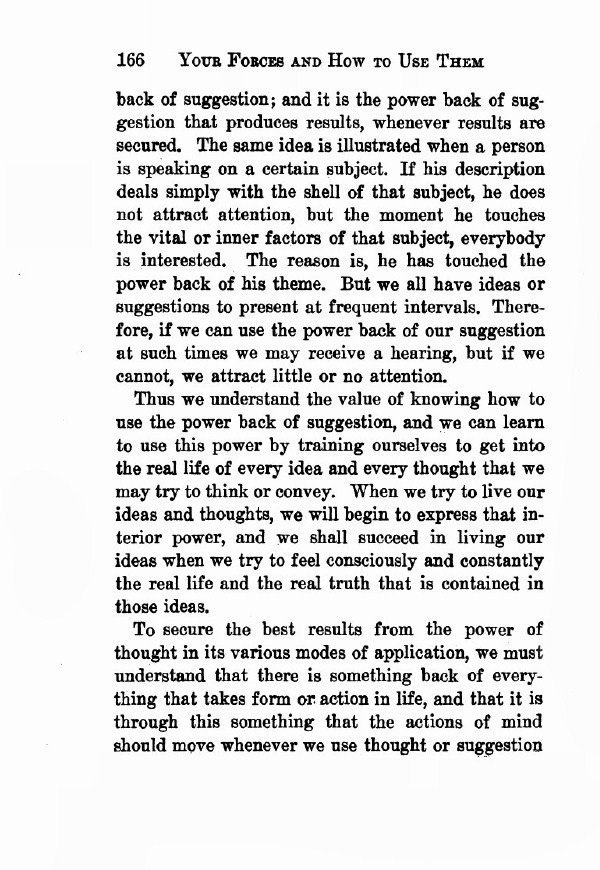 back of suggestion; and it is the power back of suggestion that produces results, whenever results are secured. The same idea is illustrated when a person is speaking on a certain subject. If their description deals simply with the shell of that subject, they do not attract attention, but the moment they touch the vital or inner factors of that subject, everybody is interested. The reason is, they have touched the power back of their theme. But we all have ideas or suggestions to present at frequent intervals. Therefore, if we can use the power back of our suggestion at such times we may receive a hearing, but if we cannot, we attract little or no attention.