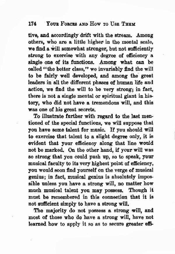 To illustrate further with regard to the last mentioned of the special functions, we will suppose that you have some talent for music. If you should will to exercise that talent to a slight degree only, it is evident that your efficiency along that line would not be marked. On the other hand, if your will was so strong that you could push up, so to speak, your musical faculty to its very highest point of efficiency, you would soon find yourself on the verge of musical genius; in fact, musical genius is absolutely impossible unless you have a strong will, no matter how much musical talent you may possess. Though it must be remembered in this connection that it is not sufficient simply to have a strong will.