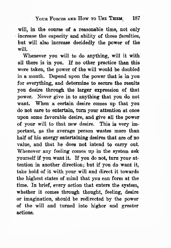 Whenever you will to do anything, will it with all there is in you. If no other practice than this were taken, the power of the will would be doubled in a month. Depend upon the power that is in you for everything, and determine to secure the results you desire through the larger expression of that power. Never give in to anything that you do not want. When a certain desire comes up that you do not care to entertain, turn your attention at once upon some favourable desire, and give all the power of your will to that new desire. This is very important, as the average person wastes more than half of their energy entertaining desires that are of no value, and that they do not intend to carry out. When ever any feeling comes up in the system ask yourself if you want it. If you do not, turn your attention in another direction; but if you do want it, take hold of it with your will and direct it towards the highest states of mind that you can form at the time. In brief, every action that enters the system, whether it comes through thought, feeling, desire or imagination, should be redirected, by the power of the will and turned into higher and greater actions.