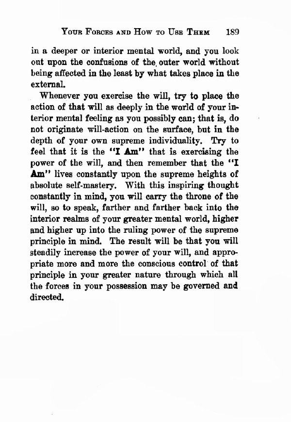 Whenever you exercise the will, try to place the action of that will as deeply in the world of your interior mental feeling as you possibly can; that is, do not originate will-action on the surface, but in the depth of your own supreme individuality. Try to feel that it is the "I Am" that is exercising the power of the will, and then remember that the "I Am" lives constantly upon the supreme heights of absolute self-mastery. With this inspiring thought constantly in mind, you will carry the throne of the will, so to speak, farther and farther back into the interior realms of your greater mental world, higher and higher up into the ruling power of the supreme principle in mind. The result will be that you will steadily increase the power of your will, and appropriate more and more the conscious control of that principle in your greater nature through which all the forces in your possession may be governed and directed