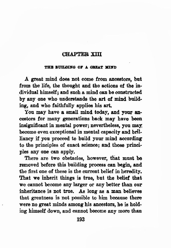 A great mind does not come from ancestors, but from the life, the thought and the actions of the individual; and such a mind can be constructed by anyone who understands the art of mind building, and who faithfully applies this art. You may have a small mind today, and your ancestors for many generations back may have been insignificant in mental power; nevertheless, you may become even exceptional in mental capacity and brilliancy if you proceed to build your mind according to the principles of exact science; and those principles anyone can apply.