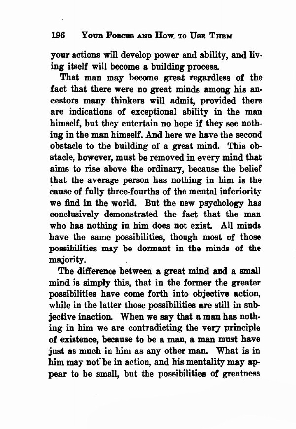 That man may become great regardless of the fact that there were no great minds among his ancestors many thinkers will admit, provided there are indications of exceptional ability in the man himself, but they entertain no hope if they see nothing in the man himself. And here we have the second obstacle to the building of a great mind. This obstacle, however must be removed in every mind that aims to rise above the ordinary, because the belief that the average person has nothing in them is the cause of fully three-fourths of the mental inferiority we find in the world. But the new psychology has conclusively demonstrated the fact that the man or woman who has nothing in them does not exist. All minds have the same possibilities, though most of those possibilities may be dormant in the minds of the majority.
