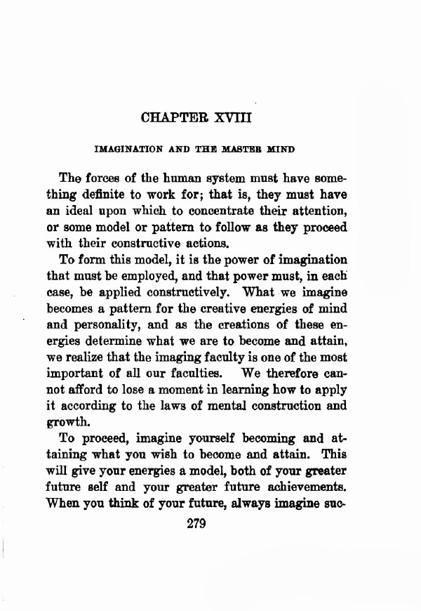 To form this model, it is the power of imagination that must be employed, and that power must, in each case, be applied constructively. What we imagine becomes a pattern for the creative energies of mind and personality, and as the creations of these energies determine what we are to become and attain, we realize that the imaging faculty is one of the most important of all our faculties. We therefore cannot afford to lose a moment in learning how to apply it according to the laws of mental construction and growth.