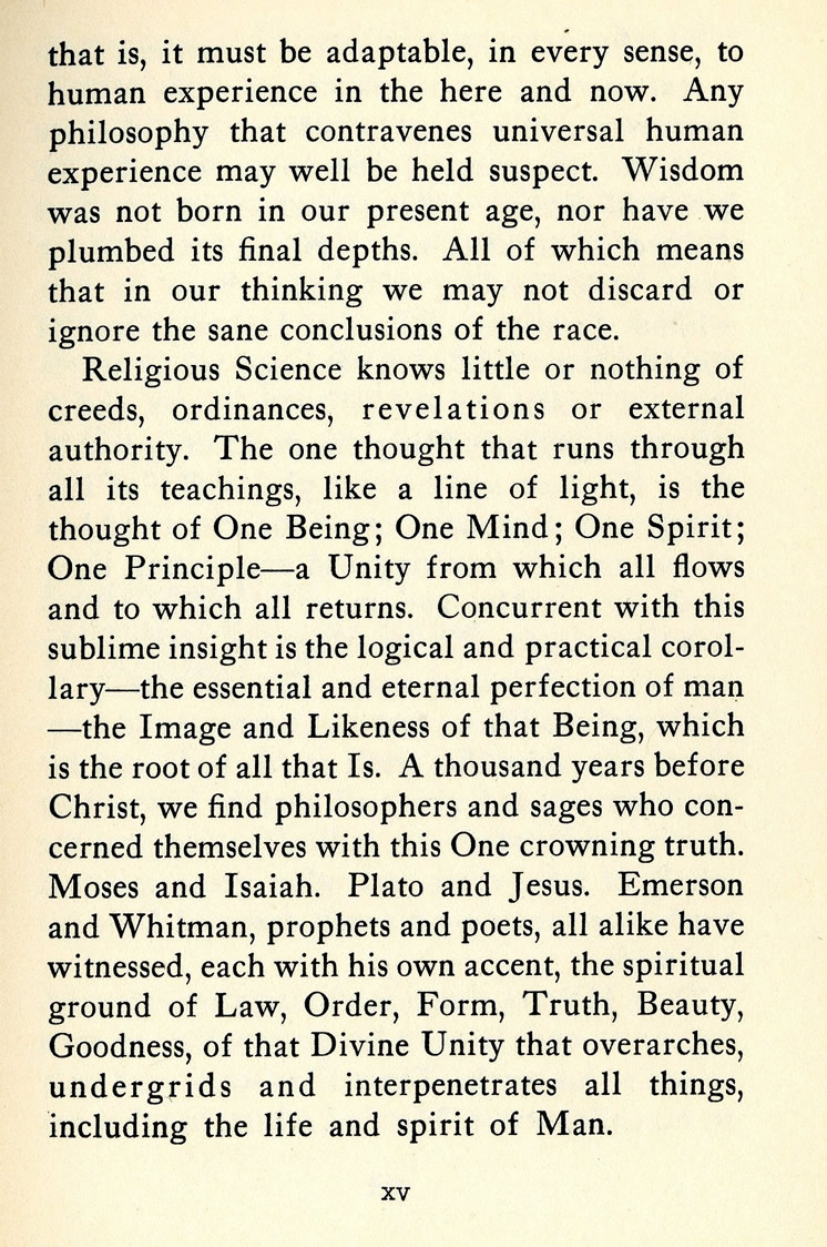 Religious Science knows little or nothing of creeds, ordinances, revelations or external authority. The one thought that runs through all its teachings, like a line of light, is the thought of One Being; One Mind; One Spirit; One Principle----a Unity from which all flows and to which all returns. Concurrent with this sublime insight is the logical and practical corollary -- the essential and eternal perfection of man -- the Image and Likeness of that Being, which is the root of all that Is. A thousand years before Christ, we find philosophers and sages who concerned themselves with this One crowning truth. Moses and Isaiah. Plato and Jesus. Emerson and Whitman, prophets and poets, all alike have witnessed, each with his own accent, the spiritual ground of Law, Order, Form, Truth, Beauty, Goodness, of that Divine Unity that overarches, undergirds and interpenetrates all things, including the life and spirit of Man.