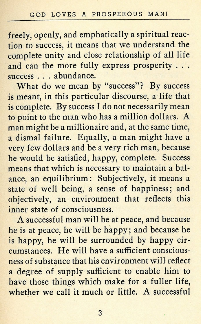 What do we mean by "success"? By success is meant, in this particular discourse, a life that is complete. By success I do not necessarily mean to point to the man who has a million dollars. A man might be a millionaire and, at the same time, a dismal failure. Equally, a man might have a very few dollars and be a very rich man, because he would be satisfied, happy, complete. Success means that which is necessary to maintain a balance, an equilibrium: Subjectively, it means a state of well being, a sense of happiness; and objectively, an environment that reflects this inner state of consciousness.