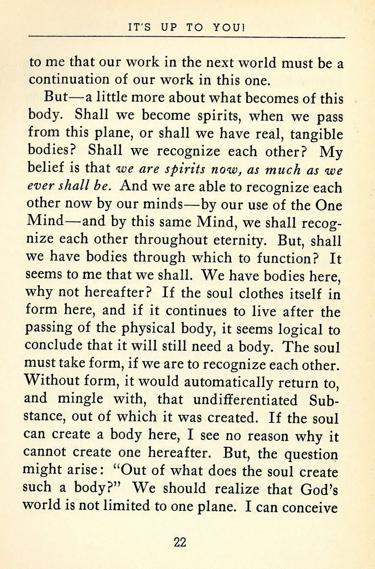 But -- a little more about what becomes of this body. Shall we become spirits, when we pass from this plane, or shall we have real, tangible bodies? Shall we recognize each other? My belief is that we are spirits now, as much as we ever shall be. And we are able to recognize each other now by our minds -- by our use of the One Mind -- and by this same Mind, we shall recognize each other throughout eternity. But, shall we have bodies through which to function? It seems to me that we shall. We have bodies here, why not hereafter? If the soul clothes itself in form here, and if it continues to live after the passing of the physical body, it seems logical to conclude that it will still need a body. The soul must take form, if we are to recognize each other.