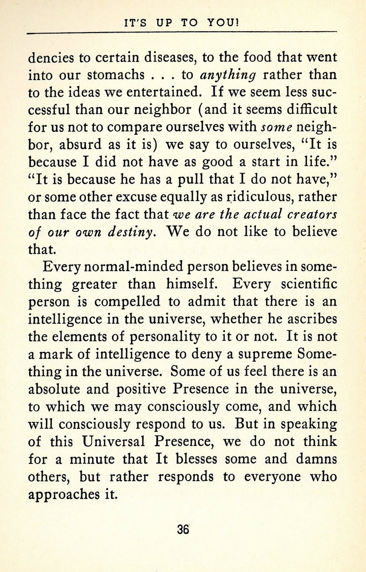 Every normal-minded person believes in something greater than himself. Every scientific person is compelled to admit that there is an intelligence in the universe, whether he ascribes the elements of personality to it or not. It is not a mark of intelligence to deny a supreme Something in the universe. Some of us feel there is an absolute and positive Presence in the universe, to which we may consciously come, and which will consciously respond to us. But in speaking of this Universal Presence, we do not think for a minute that It blesses some and damns others, but rather responds to everyone who approaches it.
