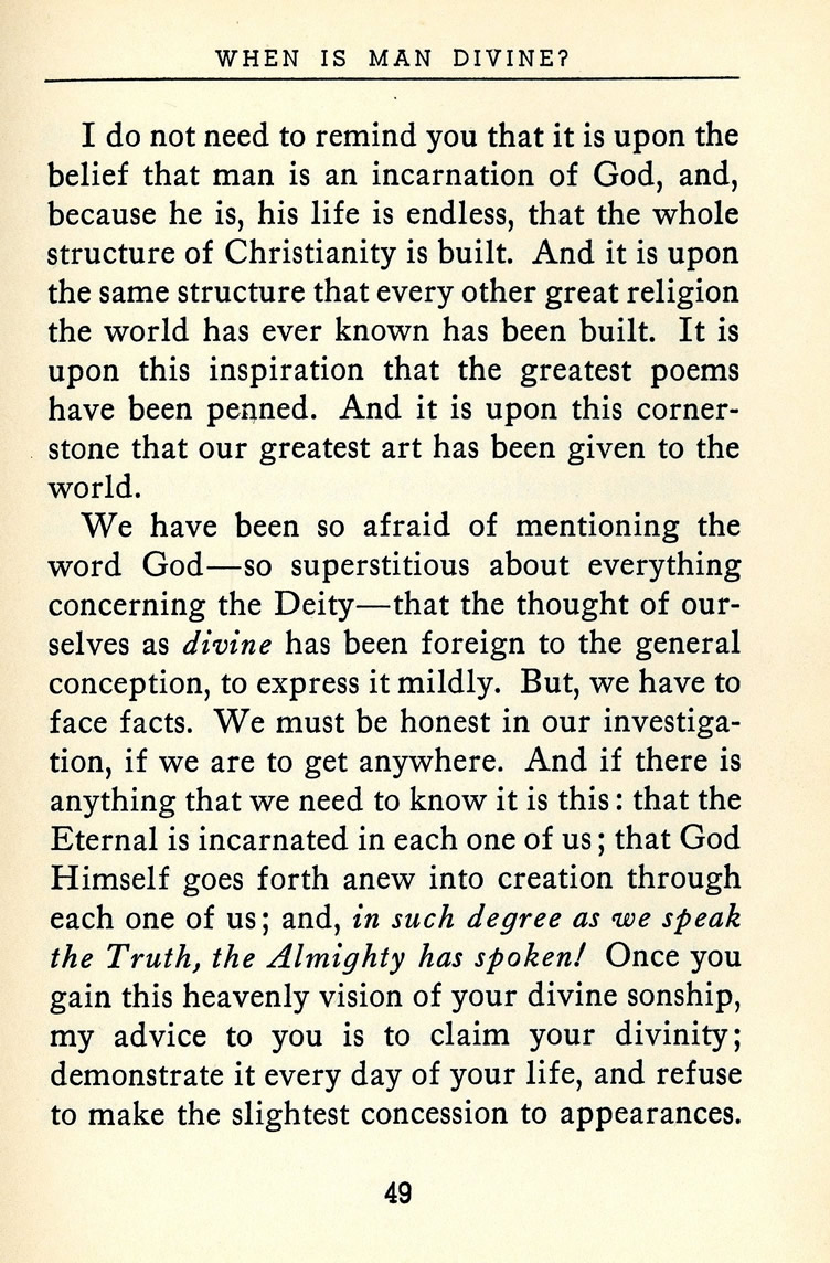We have been so afraid of mentioning the word God -- so superstitious about everything concerning the Deity -- that the thought of ourselves as divine has been foreign to the general conception, to express it mildly. But, we have to face facts. We must be honest in our investigation, if we are to get anywhere. And if there is anything that we need to know it is this: that the Eternal is incarnated in each one of us; that God Himself goes forth anew into creation through each one of us; and, in such degree as we speak the Truth, the Almighty has spoken! Once you gain this heavenly vision of your divine sonship, my advice to you is to claim your divinity; demonstrate it every day of your life, and refuse to make the slightest concession to appearances.