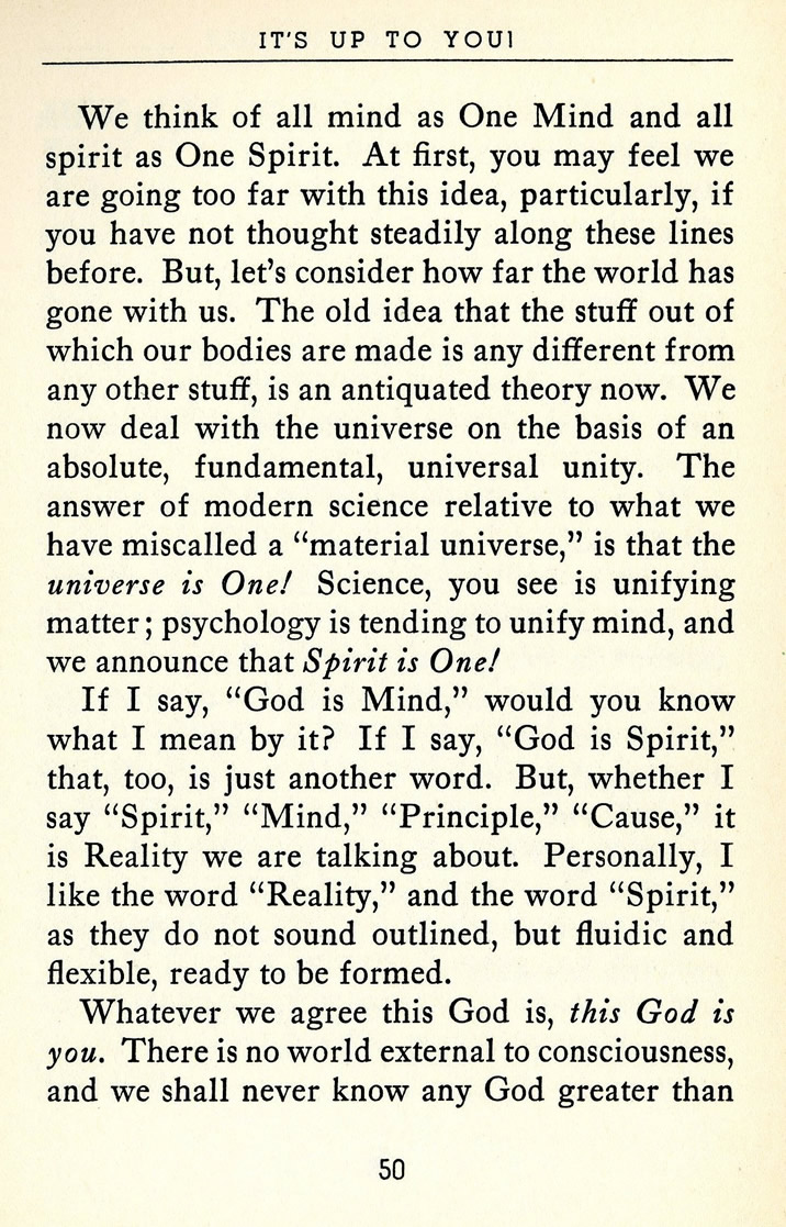 We think of all mind as One Mind and all spirit as One Spirit. At first, you may feel we are going too far with this idea, particularly, if you have not thought steadily along these lines before. But, let's consider how far the world has gone with us. The old idea that the stuff out of which our bodies are made is any different from any other stuff, is an antiquated theory now. We now deal with the universe on the basis of an absolute, fundamental, universal unity. The answer of modern science relative to what we have miscalled a "material universe," is that the universe is One! Science, you see is unifying matter; psychology is tending to unify mind, and we announce that Spirit is One!