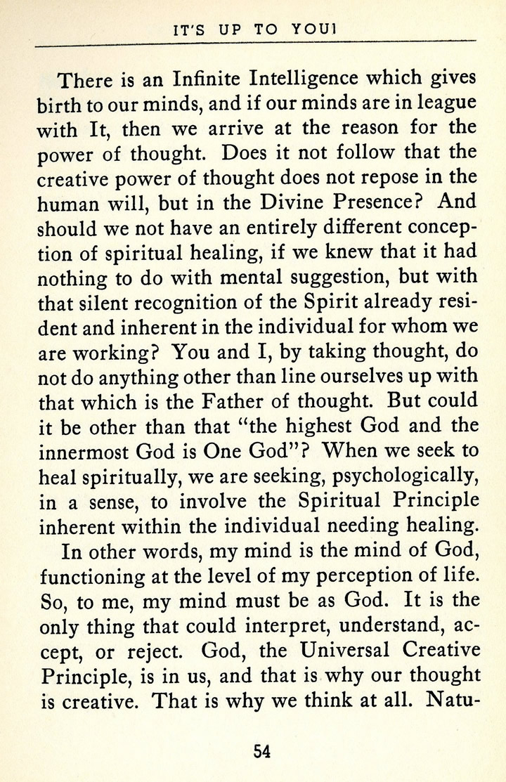 There is an Infinite Intelligence which gives birth to our minds, and if our minds are in league with It, then we arrive at the reason for the power of thought. Does it not follow that the creative power of thought does not repose in the human will, but in the Divine Presence? And should we not have an entirely different conception of spiritual healing, if we knew that it had nothing to do with mental suggestion, but with that silent recognition of the Spirit already resident and inherent in the individual for whom we are working? You and I, by taking thought, do not do anything other than line ourselves up with that which is the Father of thought. But could it be other than that "the highest God and the innermost God is One God"? When we seek to heal spiritually, we are seeking, psychologically, in a sense, to involve the Spiritual Principle inherent within the individual needing healing.