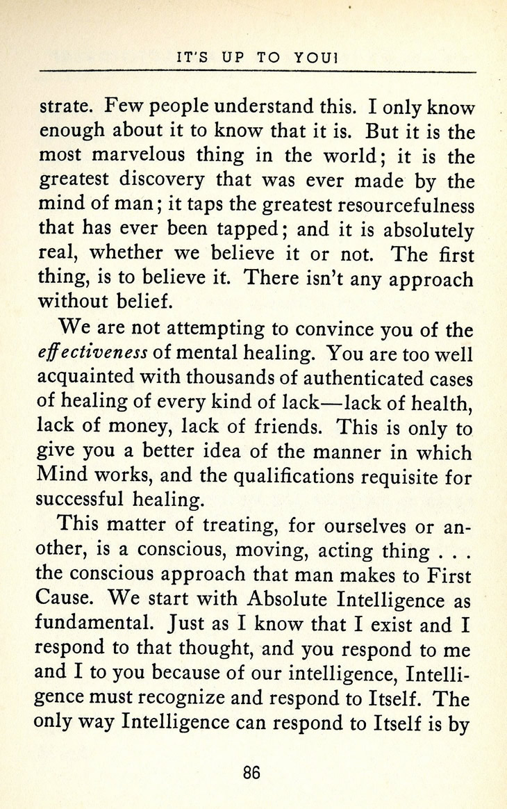 This matter of treating, for ourselves or another, is a conscious, moving, acting thing .. . the conscious approach that man makes to First Cause. We start with Absolute Intelligence as fundamental. Just as I know that I exist and I respond to that thought, and you respond to me and I to you because of our intelligence, Intelligence must recognize and respond to Itself. The only way Intelligence can respond to Itself is by