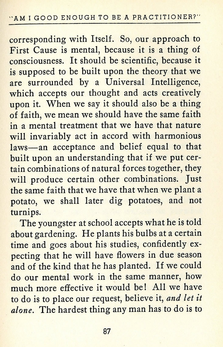corresponding with Itself. So, our approach to First Cause is mental, because it is a thing of consciousness. It should be scientific, because it is supposed to be built upon the theory that we are surrounded by a Universal Intelligence, which accepts our thought and acts creatively upon it. When we say it should also be a thing of faith, we mean we should have the same faith in a mental treatment that we have that nature will invariably act in accord with harmonious laws -- an acceptance and belief equal to that built upon an understanding that if we put certain combinations of natural forces together, they will produce certain other combinations. Just the same faith that we have that when we plant a potato, we shall later dig potatoes, and not turnips.