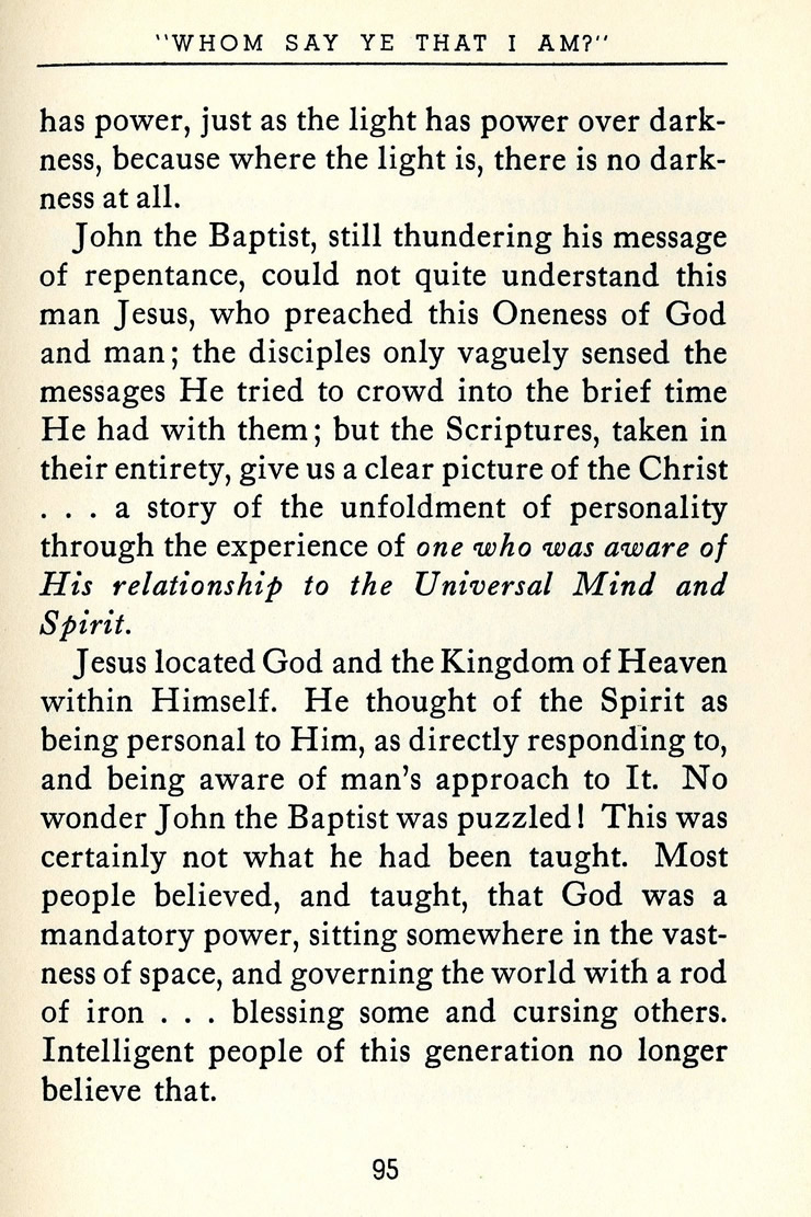 Jesus located God and the Kingdom of Heaven within Himself. He thought of the Spirit as being personal to Him, as directly responding to, and being aware of man's approach to It. No wonder John the Baptist was puzzled I This was certainly not what he had been taught. Most people believed, and taught, that God was a mandatory power, sitting somewhere in the vast-ness of space, and governing the world with a rod of iron . . . blessing some and cursing others. Intelligent people of this generation no longer believe that.