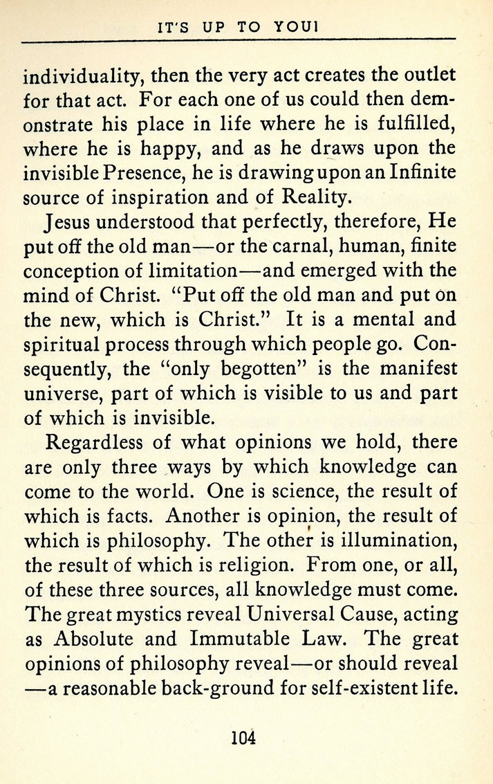 Regardless of what opinions we hold, there are only three ways by which knowledge can come to the world. One is science, the result of which is facts. Another is opinion, the result of which is philosophy. The other is illumination, the result of which is religion. From one, or all, of these three sources, all knowledge must come. The great mystics reveal Universal Cause, acting as Absolute and Immutable Law. The great opinions of philosophy reveal -- or should reveal -- a reasonable back-ground for self-existent life.
