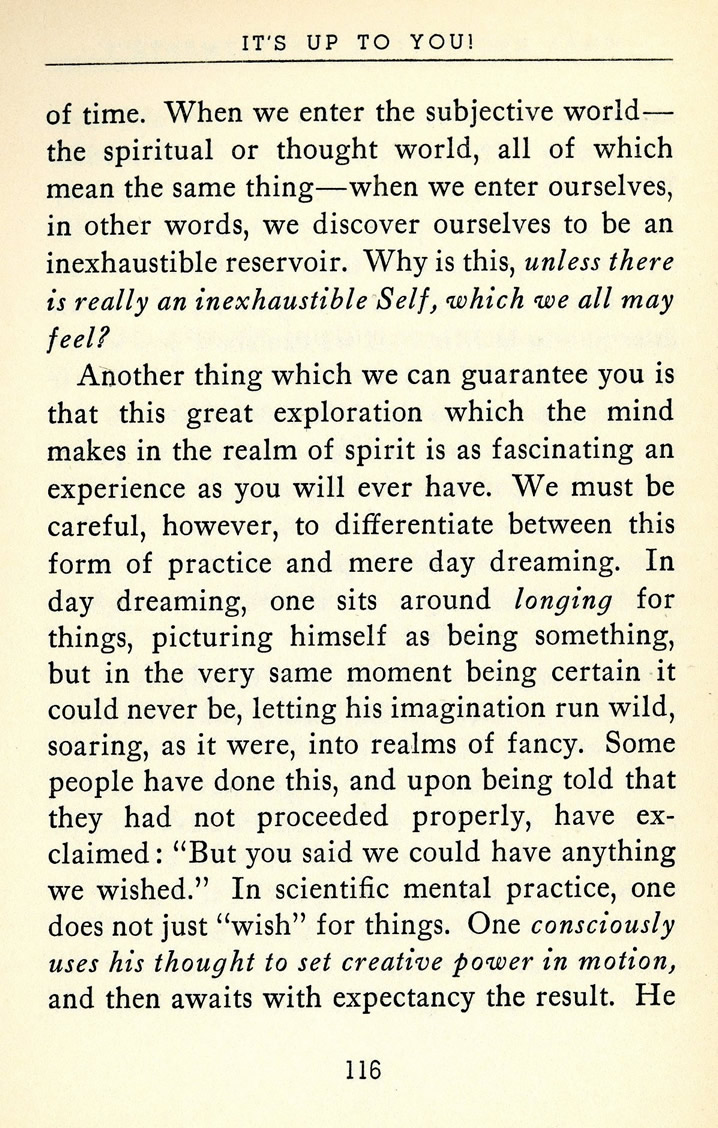 Another thing which we can guarantee you is that this great exploration which the mind makes in the realm of spirit is as fascinating an experience as you will ever have. We must be careful, however, to differentiate between this form of practice and mere day dreaming. In day dreaming, one sits around longing for things, picturing himself as being something, but in the very same moment being certain it could never be, letting his imagination run wild, soaring, as it were, into realms of fancy. Some people have done this, and upon being told that they had not proceeded properly, have exclaimed: "But you said we could have anything we wished." In scientific mental practice, one does not just "wish" for things. One consciously uses his thought to set creative power in motion, and then awaits with expectancy the result. He