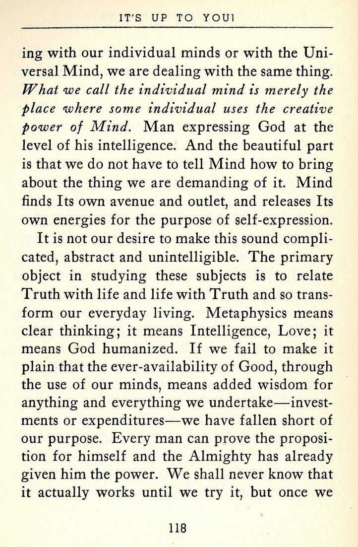 It is not our desire to make this sound complicated, abstract and unintelligible. The primary object in studying these subjects is to relate Truth with life and life with Truth and so transform our everyday living. Metaphysics means clear thinking; it means Intelligence, Love; it means God humanized. If we fail to make it plain that the ever-availability of Good, through the use of our minds, means added wisdom for anything and everything we undertake -- investments or expenditures -- we have fallen short of our purpose. Every man can prove the proposition for himself and the Almighty has already given him the power. We shall never know that it actually works until we try it, but once we