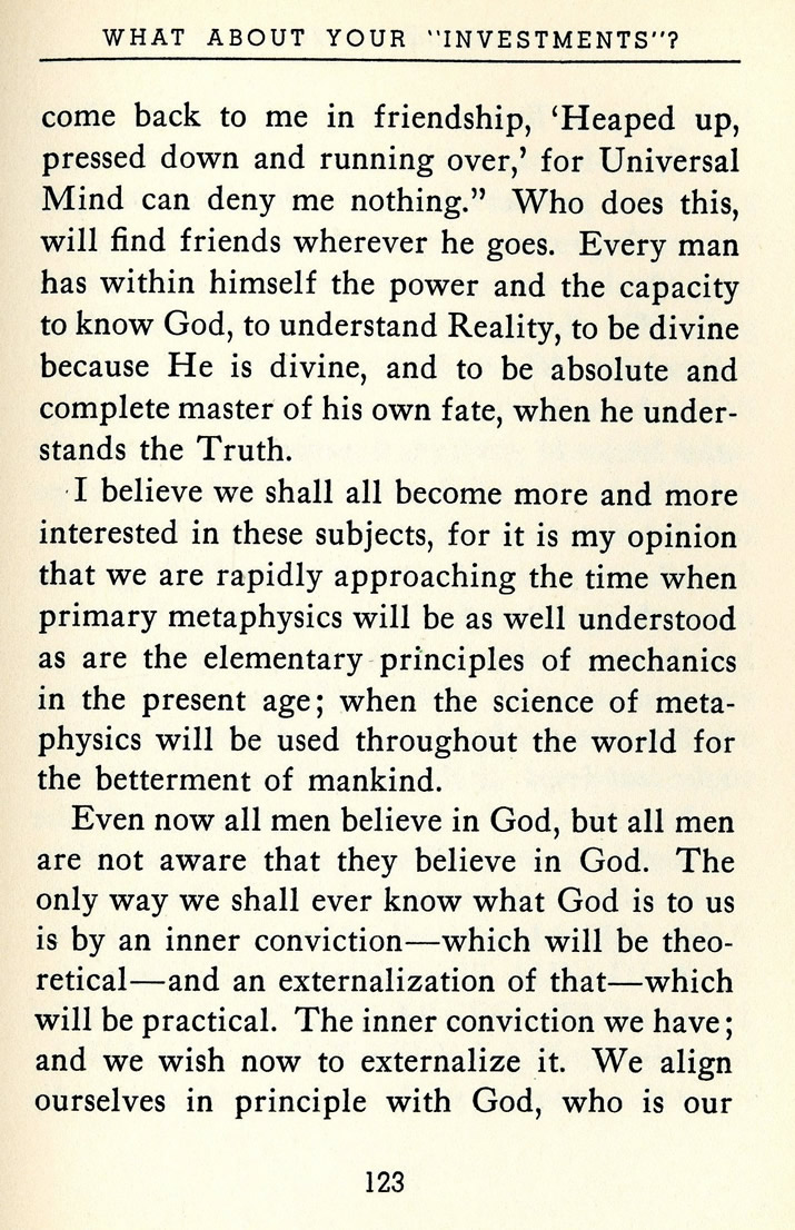 come back to me in friendship, 'Heaped up, pressed down and running over,' for Universal Mind can deny me nothing." Who does this, will find friends wherever he goes. Every man has within himself the power and the capacity to know God, to understand Reality, to be divine because He is divine, and to be absolute and complete master of his own fate, when he understands the Truth.