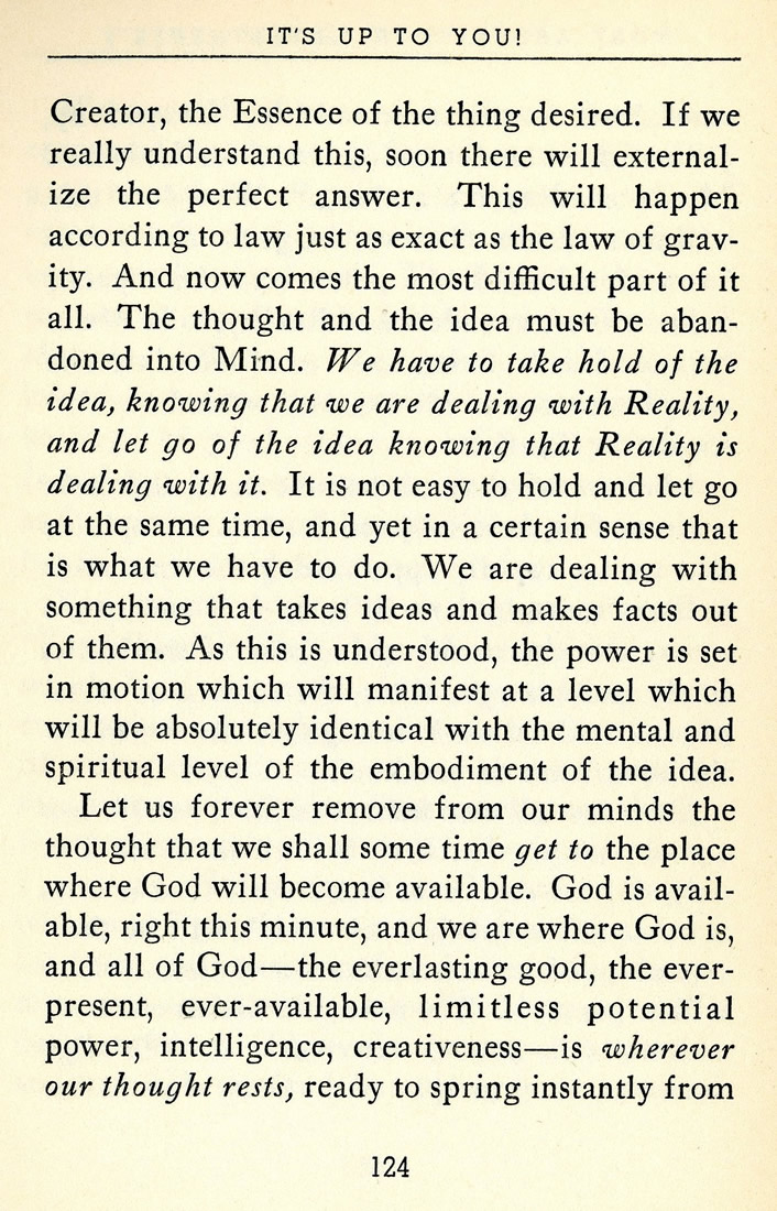 Creator, the Essence of the thing desired. If we really understand this, soon there will externalize the perfect answer. This will happen according to law just as exact as the law of gravity. And now comes the most difficult part of it all. The thought and the idea must be abandoned into Mind. We have to take hold of the idea, knowing that we are dealing with Reality, and let go of the idea knowing that Reality is dealing with it. It is not easy to hold and let go at the same time, and yet in a certain sense that is what we have to do. We are dealing with something that takes ideas and makes facts out of them. As this is understood, the power is set in motion which will manifest at a level which will be absolutely identical with the mental and spiritual level of the embodiment of the idea.