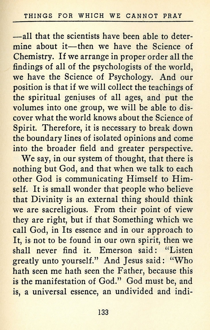 We say, in our system of thought, that there is nothing but God, and that when we talk to each other God is communicating Himself to Him-self. It is small wonder that people who believe that Divinity is an external thing should think we are sacrilegious. From their point of view they are right, but if that Something which we call God, in Its essence and in our approach to It, is not to be found in our own spirit, then we shall never find it. Emerson said: "Listen greatly unto yourself." And Jesus said: "Who hath seen me hath seen the Father, because this is the manifestation of God." God must be, and is, a universal essence, an undivided and indivisible