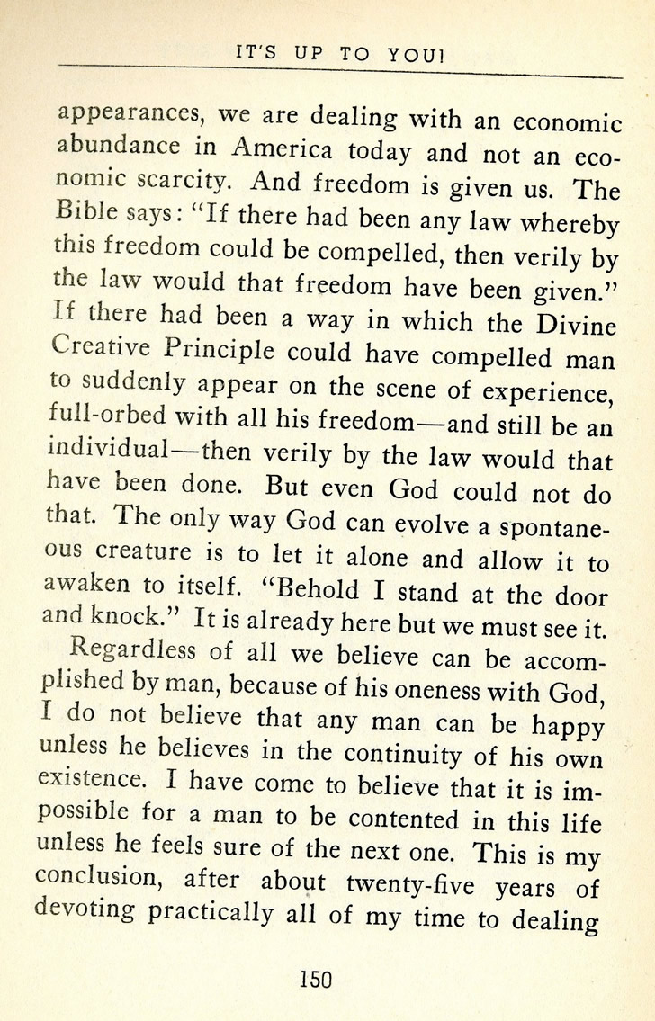 appearances, we are dealing with an economic abundance in America today and not an economic scarcity. And freedom is given us. The Bible says: "If there had been any law whereby this freedom could be compelled, then verily by the law would that freedom have been given." If there had been a way in which the Divine Creative Principle could have compelled man to suddenly appear on the scene of experience, full-orbed with all his freedom -- and still be an individual -- then verily by the law would that have been done. But even God could not do that. The only way God can evolve a spontaneous creature is to let it alone and allow it to awaken to itself. "Behold I stand at the door and knock." It is already here but we must see it.