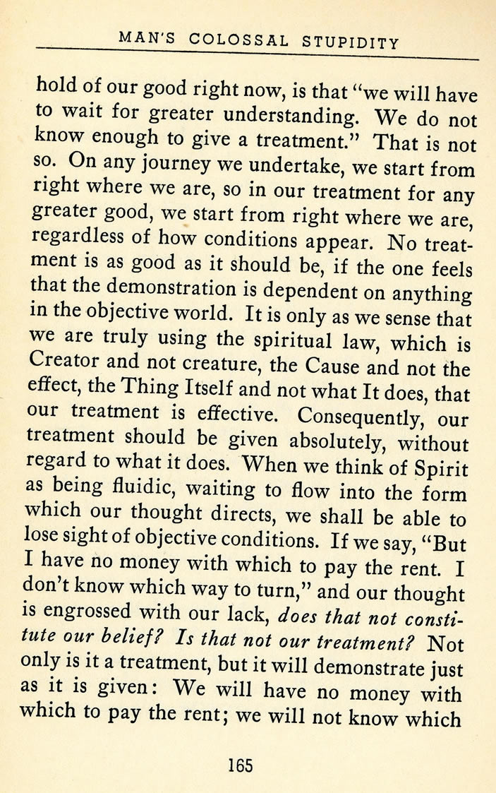 hold of our good right now, is that "we will have to wait for greater understanding. We do not know enough to give a treatment." That is not so. On any journey we undertake, we start from right where we are, so in our treatment for any greater good, we start from right where we are, regardless of how conditions appear. No treatment is as good as it should be, if the one feels that the demonstration is dependent on anything in the objective world. It is only as we sense that we are truly using the spiritual law, which is Creator and not creature, the Cause and not the effect, the Thing Itself and not what It does, that our treatment is effective. Consequently, our treatment should be given absolutely, without regard to what it does. When we think of Spirit as being fluidic, waiting to flow into the form which our thought directs, we shall be able to lose sight of objective conditions. If we say, "But I have no money with which to pay the rent. I don't know which way to turn," and our thought is engrossed with our lack, does that not constitute our belief? Is that not our treatment? Not only is it a treatment, but it will demonstrate just as it is given: We will have no money with which to pay the rent; we will not know which