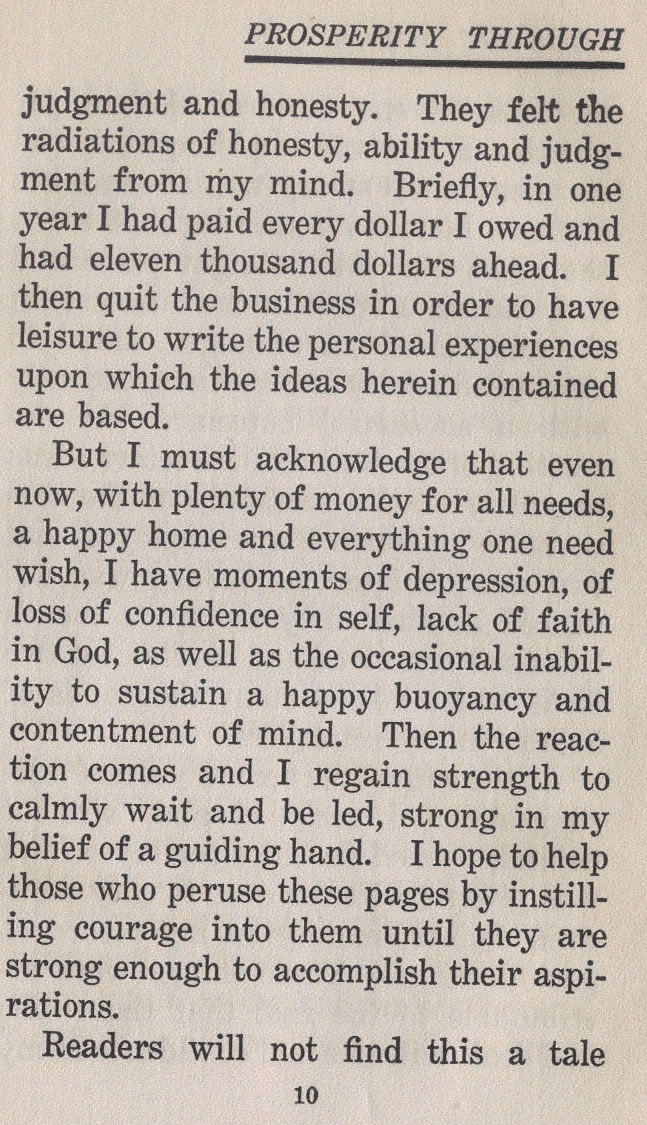 But I must acknowledge that even now, with plenty of money for all needs, a happy home and everything one need wish, I have moments of depression, of loss of confidence in self, lack of faith in God, as well as the occasional inability to sustain a happy buoyancy and contentment of mind. Then the reaction comes and I regain strength to calmly wait and be led, strong in my belief of a guiding hand. I hope to help those who peruse these pages by instilling courage into them until they are strong enough to accomplish their aspirations.