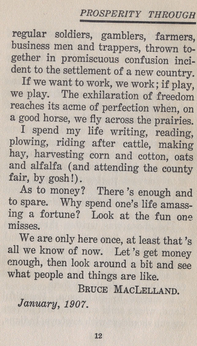 I spend my life writing, reading, plowing, riding after cattle, making hay, harvesting corn and cotton, oats and alfalfa (and attending the county fair, by gosh!).