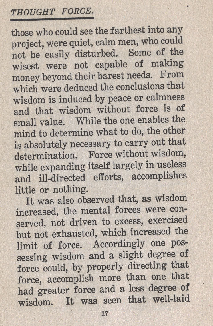 those who could see the farthest into any project, were quiet, calm men, who could not be easily disturbed. Some of the wisest were not capable of making money beyond their barest needs. From which were deduced the conclusions that wisdom is induced by peace or calmness and that wisdom without force is of small value. While the one enables the mind to determine what to do, the other is absolutely necessary to carry out that determination. Force without wisdom, while expanding itself largely in useless and ill-directed efforts, accomplishes little or nothing.
