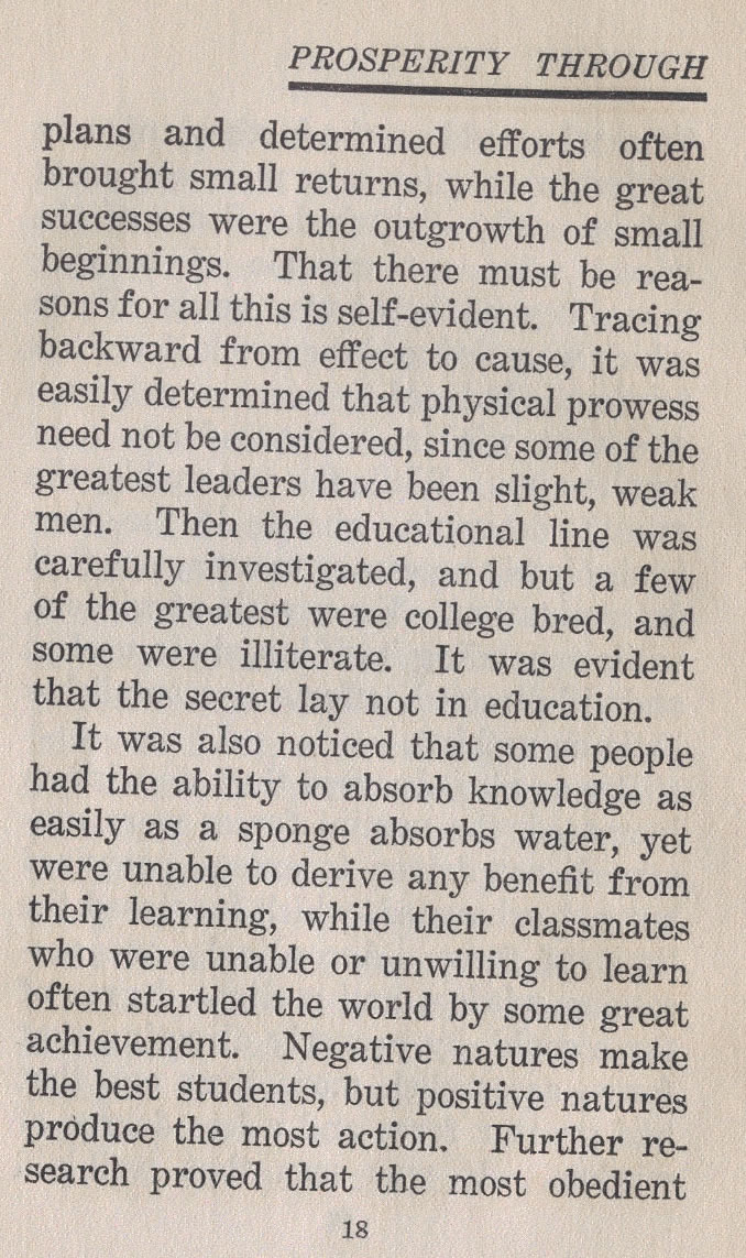 It was also noticed that some people had the ability to absorb knowledge as easily as a sponge absorbs water, yet were unable to derive any benefit from their learning, while their classmates who were unable or unwilling to learn often startled the world by some great achievement. Negative natures make the best students, but positive natures produce the most action. Further research proved that the most obedient