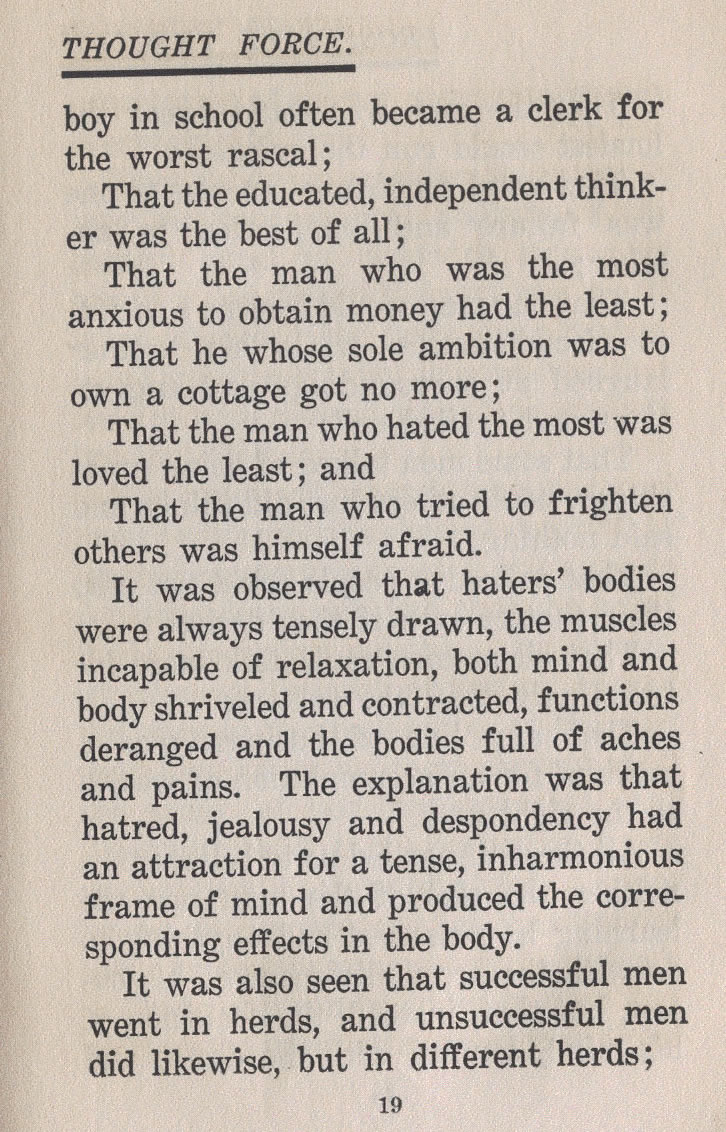 It was observed that haters' bodies were always tensely drawn, the muscles incapable of relaxation, both mind and body shriveled and contracted, functions deranged and the bodies full of aches and pains. The explanation was that hatred, jealousy and despondency had an attraction for a tense, inharmonious frame of mind and produced the corresponding effects in the body.