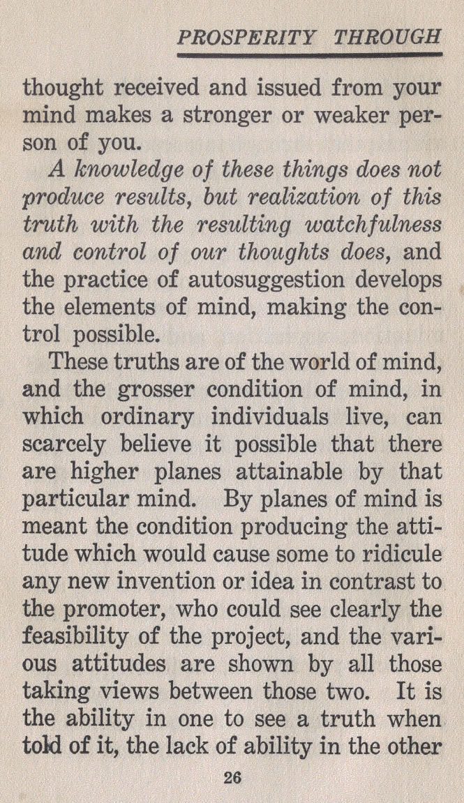 A knowledge of these things does not produce results, but realization of this truth with the resulting watchfulness and control of our thoughts does, and the practice of autosuggestion develops the elements of mind, making the control possible.