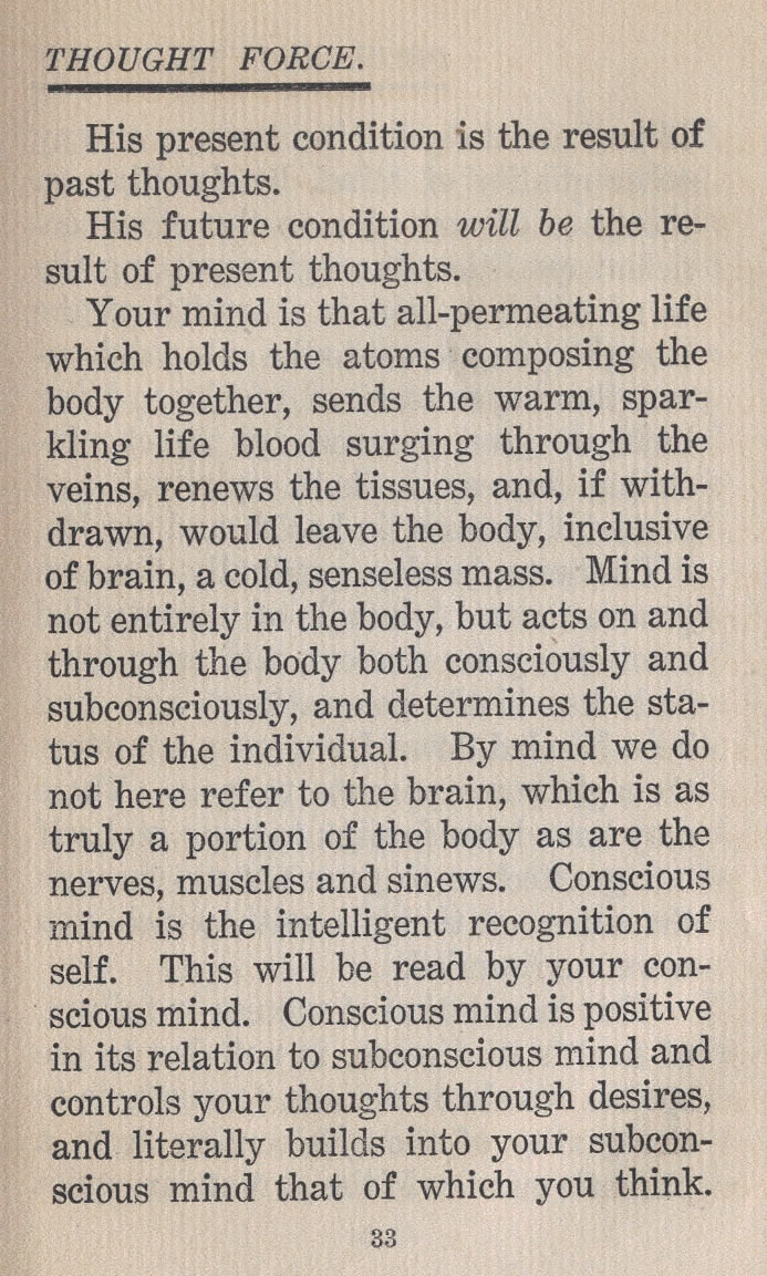 Your mind is that all-permeating life which holds the atoms composing the body together, sends the warm, sparkling life blood surging through the veins, renews the tissues, and, if withdrawn, would leave the body, inclusive of brain, a cold, senseless mass. Mind is not entirely in the body, but acts on and through the body both consciously and subconsciously, and determines the status of the individual. By mind we do not here refer to the brain, which is as truly a portion of the body as are the nerves, muscles and sinews. Conscious mind is the intelligent recognition of self. This will be read by your conscious mind. Conscious mind is positive in its relation to subconscious mind and controls your thoughts through desires, and literally builds into your subconscious mind that of which you think.