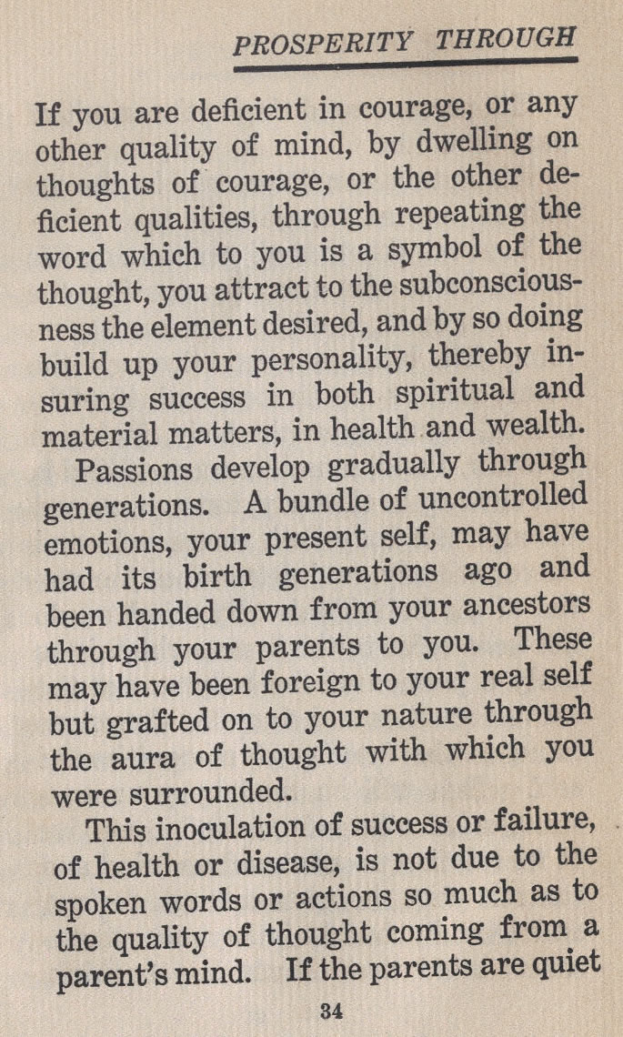 If you are deficient in courage, or any other quality of mind, by dwelling on thoughts of courage, or the other deficient qualities, through repeating the word which to you is a symbol of the thought, you attract to the subconsciousness the element desired, and by so doing build up your personality, thereby insuring success in both spiritual and material matters, in health and wealth.