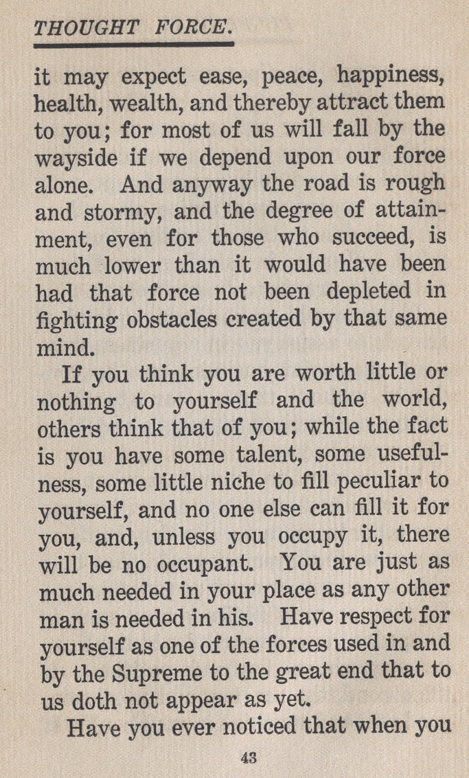 it may expect ease, peace, happiness, health, wealth, and thereby attract them to you; for most of us will fall by the wayside if we depend upon our force alone. And anyway the road is rough and stormy, and the degree of attainment, even for those who succeed, is much lower than it would have been had that force not been depleted in fighting obstacles created by that same mind.