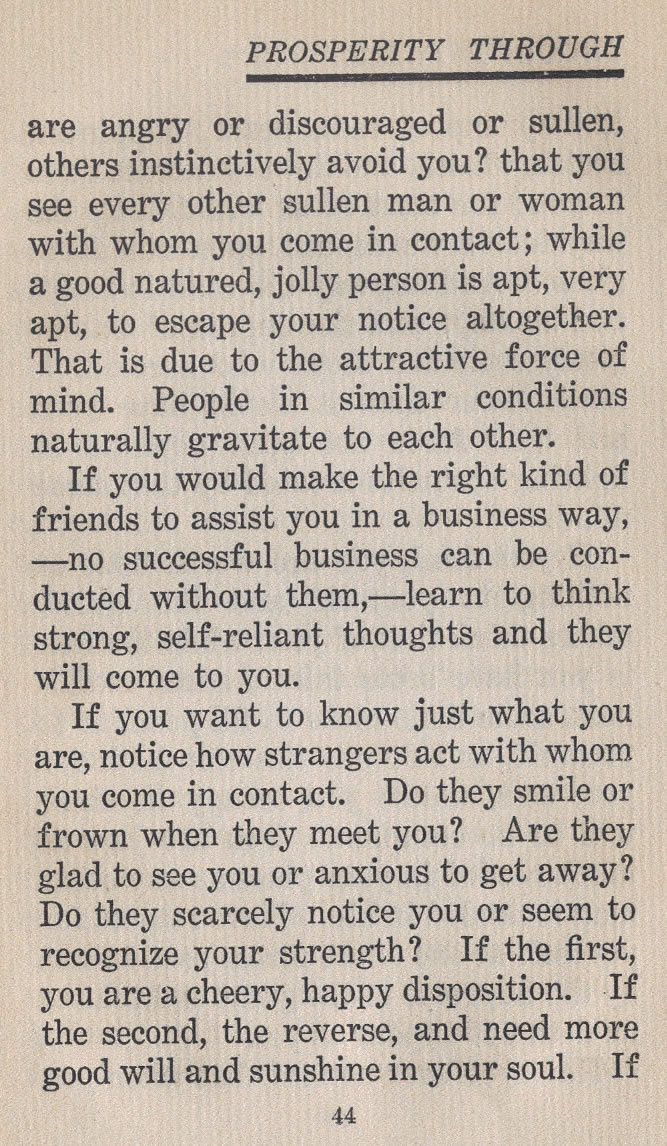 are angry or discouraged or sullen, others instinctively avoid you? that you see every other sullen man or woman with whom you come in contact; while a good natured, jolly person is apt, very apt, to escape your notice altogether. That is due to the attractive force of mind. People in similar conditions naturally gravitate to each other.