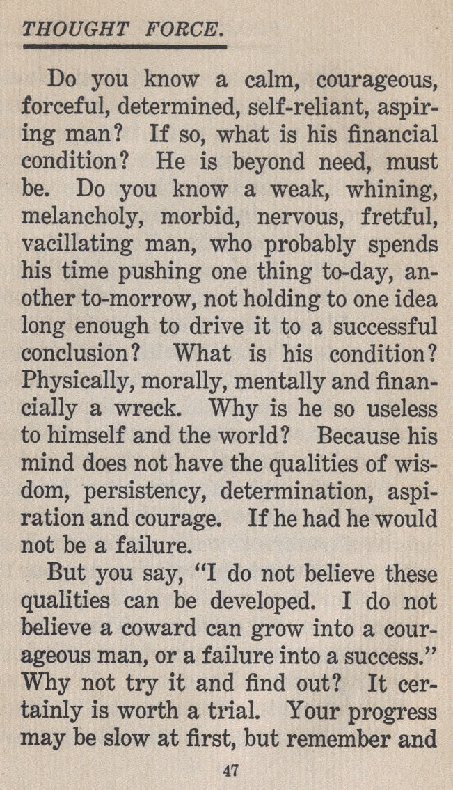 Do you know a calm, courageous, forceful, determined, self-reliant, aspiring man? If so, what is his financial condition? He is beyond need, must be. Do you know a weak, whining, melancholy, morbid, nervous, fretful, vacillating man, who probably spends his time pushing one thing to-day, another to-morrow, not holding to one idea long enough to drive it to a successful conclusion? What is his condition? Physically, morally, mentally and financially a wreck. Why is he so useless to himself and the world? Because his mind does not have the qualities of wisdom, persistency, determination, aspiration and courage. If he had he would not be a failure.
