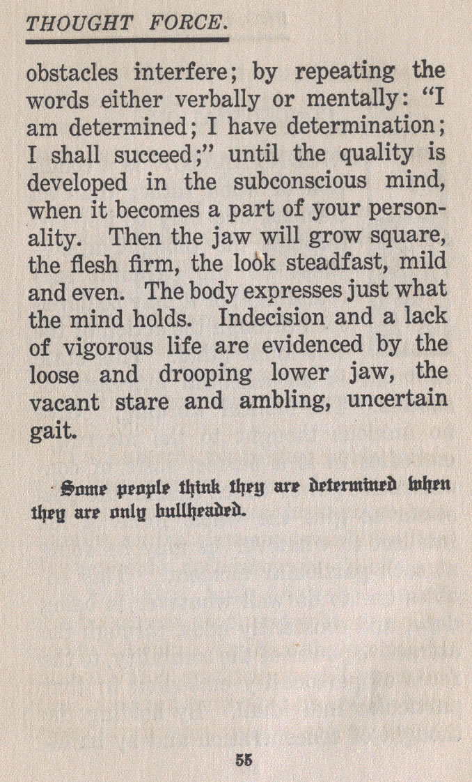 obstacles interfere; by repeating the words either verbally or mentally: "I am determined; I have determination; I shall succeed;" until the quality is developed in the subconscious mind, when it becomes a part of your personality. Then the jaw will grow square, the flesh firm, the look steadfast, mild and even. The body expresses just what the mind holds. Indecision and a lack of vigorous life are evidenced by the loose and drooping lower jaw, the vacant stare and ambling, uncertain gait.